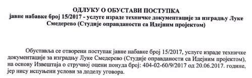 SMEDEREVO, 12. jul 2017 – Javna nabavka, kojom je Ministarstvo građevinarstva, saobraćaja i infrastrukture tražilo izvođača koji će sačiniti tehničku dokumentaciju za izgradnju luke Smederevo, obustavljena je. Javila su se dva potencijalna izvođača za izradu dokumentacije, studije opravdanosti sa idejnim projektom, jedan domaći i jedan iz Italije, ali „nisu ispunjeni uslovi za dodelu ugovora“, stoji u obrazloženju.