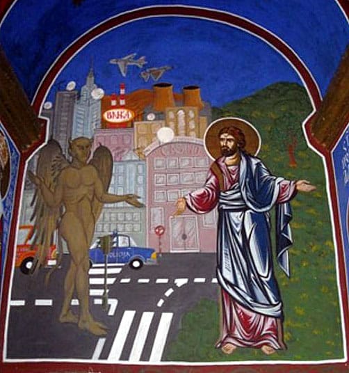 Naime, tu je jedna od najneobičnijih fresaka, kako po tematici tako i po kompoziciji. Na fresci je prikazan susret Isusa Hrista i Satane, što je samo po sebi neobičan motiv, no je još neobičniji ambijent u kome se susret dešava. Jer, Hrist i đavo se sreću na pešačkom prelazu, a iza njih se mogu videti savremene građevine, jedna koja je verovatno Empajer Stejt Bilding, ali i nuklearna elektrana, banka, kazino… Za ova dva poslednja nema dileme, tu su latinični natpisi na zgradama. Da dve bude zanimljivije, u prizor su ukomponovani i policijski automobil, i na njemu je natpis koji ne da da bude zabune, i vatrogasna kola, a čitav prizor nadleću vojni avioni.
