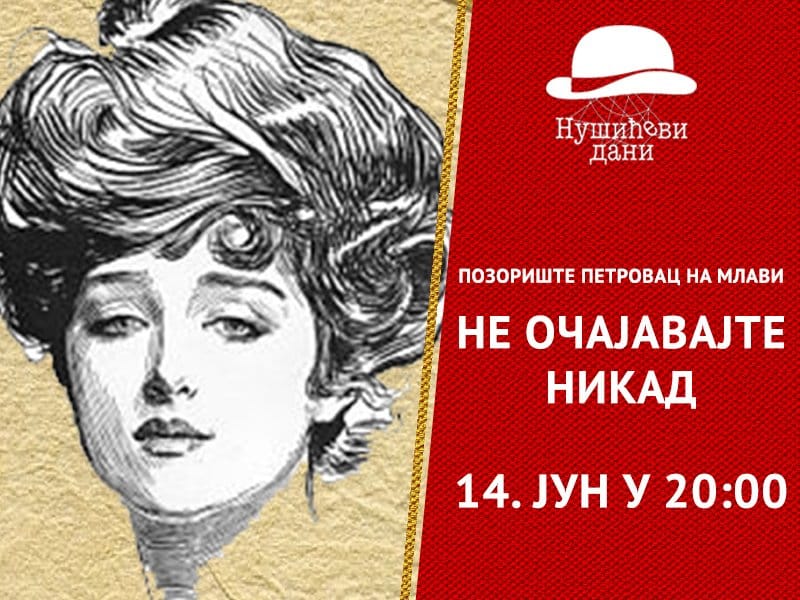 Od 20 sati, glumci pozorišta „Dragoljub Milosavljević Gula“ iz Petrovca na Mlavi nastupiće sa predstavom „Ne očajavajte nikad“ koju je prema delu Branislava Nušića režirao Miloš Jagodić. U priči o renterijeru koji se iz ljubavi oženio ženom kojoj je izdavao stan, u trenutku kada su oboje verovali da je njen muž poginuo u ratu, Nušić je koristio melodramska sredstva u čisto komediografske svrhe.