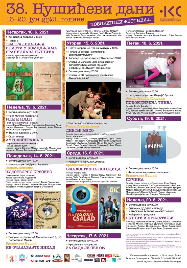 “Ožaloščena porodica”, po motivima istoimene komedije Branislava Nušića, u režiji Andreja Boka i izvođenju Narodnog pozorišta iz Subotice, na repertoaru je 16. juna, dok će 17. juna posetioci festivala imati priliku da pogledaju izvođenje predstave “Za sada je sve ok”, Kruševačkog pozorišta, čiju režiju potpisuje Snežana Trišić. U petak, 18. juna posetioce očekuje “Pokondirena tikva” u režiji Đurđe Tešić, koju izvodi Narodno pozorište “Sterija”. Predstava “Pučina”, po tekstu Branislava Nušića, u režiji Egona Savina, je u subotu 19. juna. Sve predstave u okviru festivala su u terminu od 20 časova i igraju se u Velikoj dvorani Centra za kulturu Smederevo.