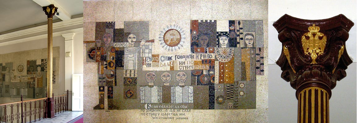 Obimnije intervencije na objektu sada već uveliko Suda izvršene su 1963. Godine, kada je postavljen i mozaik na zidu centralnog stepeništa koje vodi na prvi sprat. Na mozaiku su dva citata; prvi je, valjda namenjen svedocima, onaj iz pesme Uroš i Mrnjavčevići, „Nemoj sine govoriti krivo, ni po babu ni po stričevima“, a drugi, najčuveniji deo iz Dušanovog zakonika, kanda sudijama – „Vsake sudije da sude po Zakoniku, a da ne sude po strahu carstva mi!“.