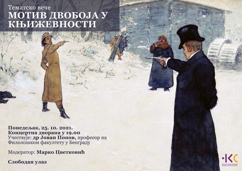 SMEDEREVO, 25. oktobar 2021 – „Motiv dvoboja u književnosti“ tema je programa koji će biti održan ovog ponedeljka u Centru za kulturu Smederevo. Tokom tematske večeri govoriće dr Jovan Popov, profesor na Filološkom fakultetu u Beogradu.