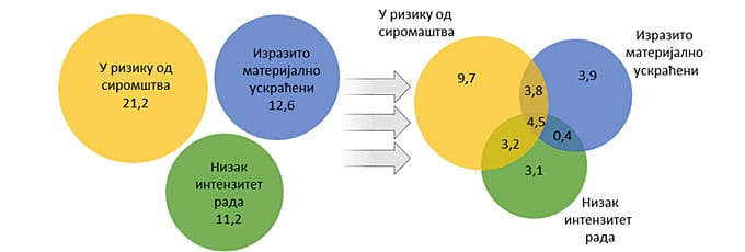 U stavke materijalne uskraćenosti ubraja se nemogućnost domaćinstva da sebi priušti adekvatno zagrevanje stana, nemogućnost da priušti mašinu za pranje veša, automobil, da svim članovima priušti nedelju dana odmora van kuće bar jednom godišnje, kao i nemogućnost da podmiri neočekivani trošak u iznosu od 19.400 dinara, koji bi bio plaćen iz budžeta domaćinstva.
