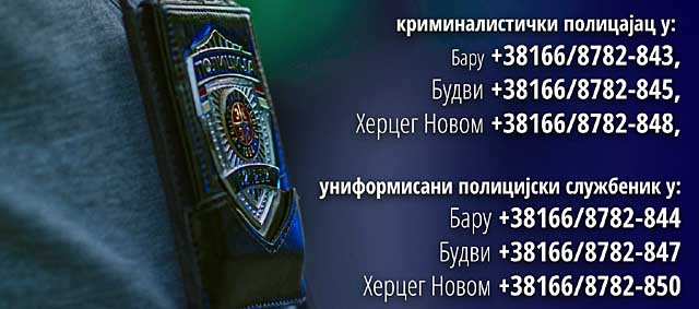 Brojevi telefona koji su dostupni su: kriminalistički policajac u Baru +38166/8782-843, u Budvi +38166/8782-845 i Herceg Novom +38166/8782-848, kao i uniformisani policijski službenik u Baru +38166/8782-844, Budvi +38166/8782-847 i Herceg Novom +38166/8782-850.