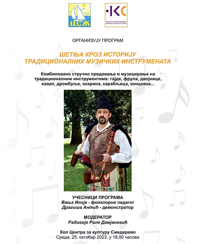 SMEDEREVO, 25. oktobar 2023 – Ove srede publika će biti u prilici da, u holu smederevskog Centra za kulturu, prisustvuje stručnom predavanju ali i muziciranju na tradicionalnom instrumentima; gajdama, fruli, dvojnicama, kavalu, drombuljama, karabljici, koncovki…