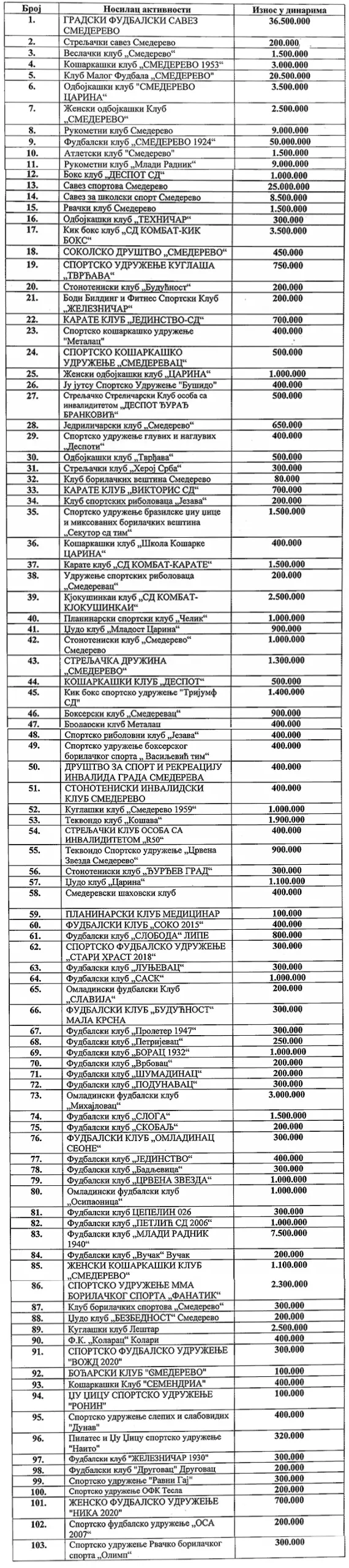 Evo kako izgleda lista sportskih kolektiva sa iznosima koji su im opredeljeni: