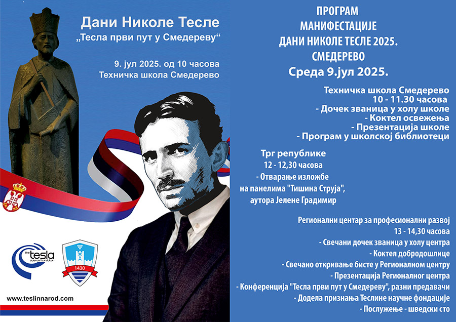 8. jul 2025 – Povodom obeležavanja rođendana Nikole Tesle i Dana nauke u Srbiji, Teslina naučna fondacija Srbija, u saradnji sa Tesla Science Foundation – Teslinom Naučnom Fondacijom iz Sjedinjenih Američkih Država, organizuje od 1. do 15. jula manifestaciju „Dani Nikole Tesle 2025.“, a Smederevo je domaćin u sredu 9. jula.