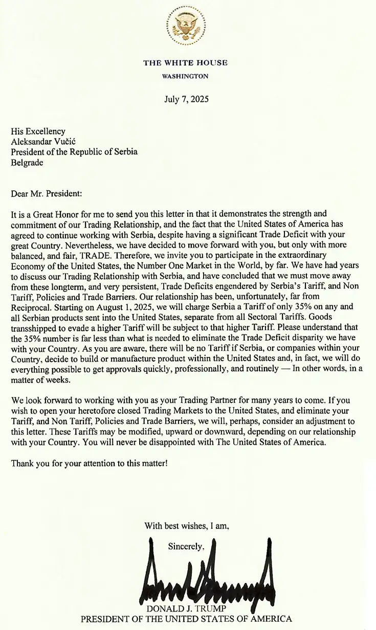 U pismu Vučiću Tramp je poručio da carina neće biti ako Srbija ili srpske kompanije odluče da proizvode u SAD, kao i da će doći do uvećanja carina ako Beograd odluči da uzvrati uvođenjem dodatnih carina na uvoz iz SAD.
