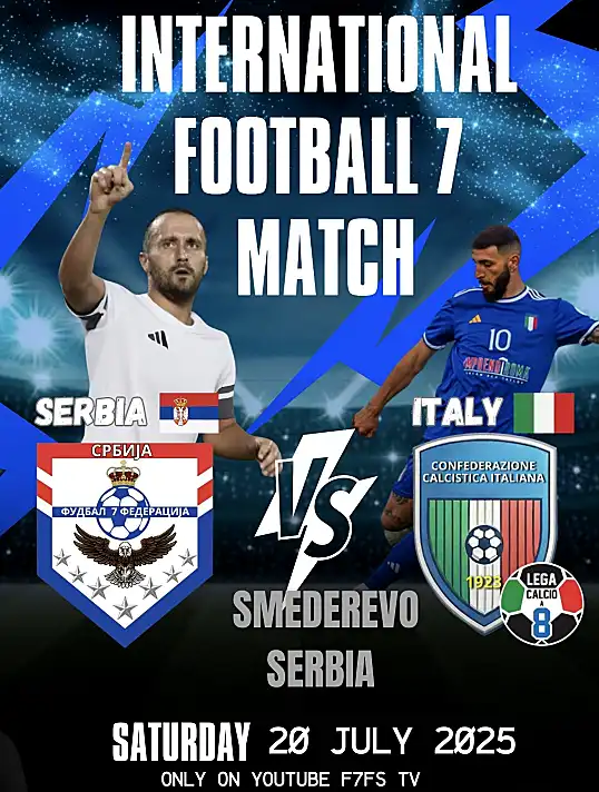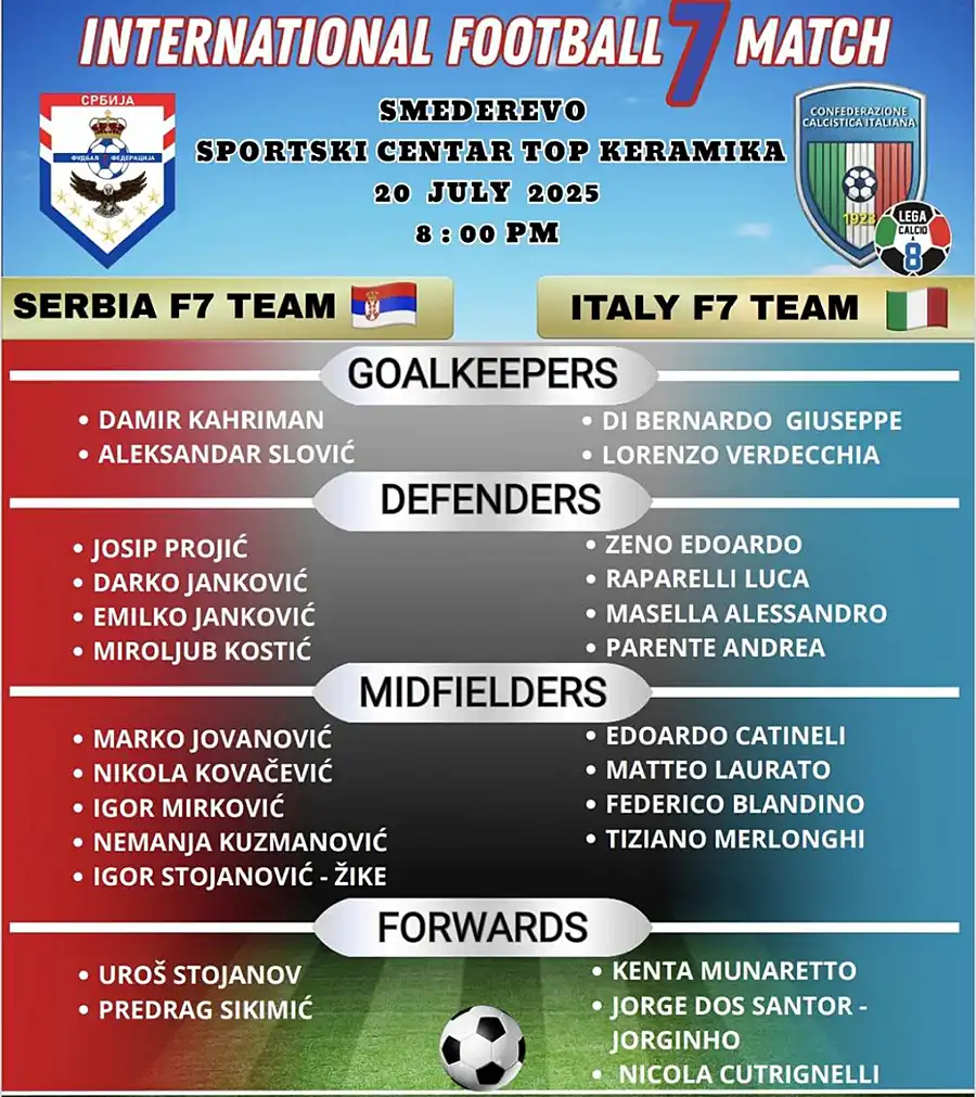 18. jul 2025 – U sklopu priprema za odlazak na Svetsko prvenstvo, koje je krajem avgusta u Brazilu, novoformirana reprezentacija Srbije u fudbalu 7, odigraće u Smederevu u nedelju prijateljsku utakmici sa vicešampionom sveta, selekcijom Italije.