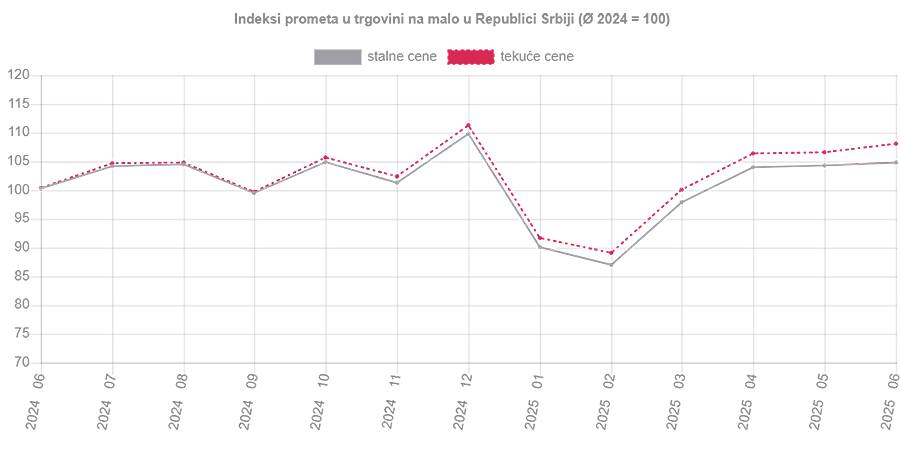 Ako se uporede prvih šest meseci 2025. godine sa istim periodom 2024. godine, promet robe u trgovini na malo veći je u tekućim cenama za 5,4 odsto. U stalnim cenama rast je bio 2,2 procenta.
