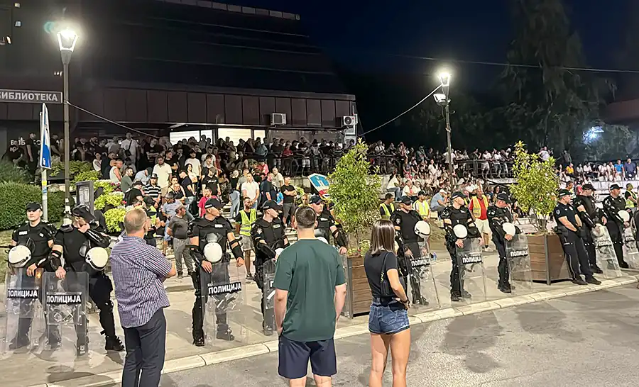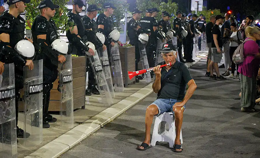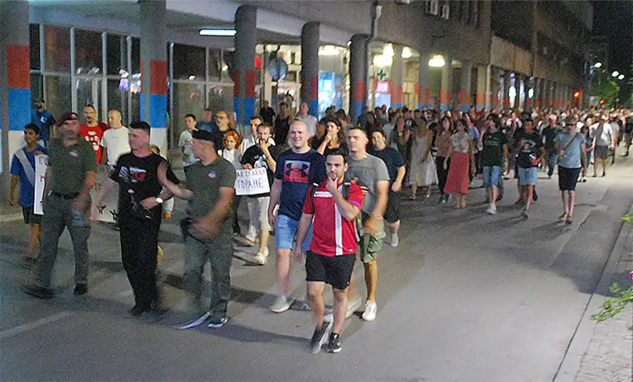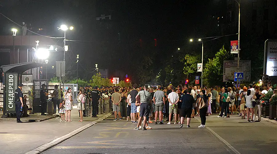 14. avgust 2025 – Protest ispred sedišta Srpske napredne stranke u Smederevu večeras je imao nastavak, sa nešto razlika u odnosu na jučerašnji. Naime, odbrana SNS-a je bila kudikamo brojnija, bili su među njima i momci u crnim majicama i s crnim kačketima, što mu sad već dođe kao neka uniforma, imali su i uredno poređane redare u fluorescentnim prslucima, a i policija je došla ovoga puta sa komplet opremom za razbijanje demonstracija i postavila se na levu ivicu trotoara Karađorđeve. Time je razmak u slučaju eventualne eskalacije bio znatno uvećan.