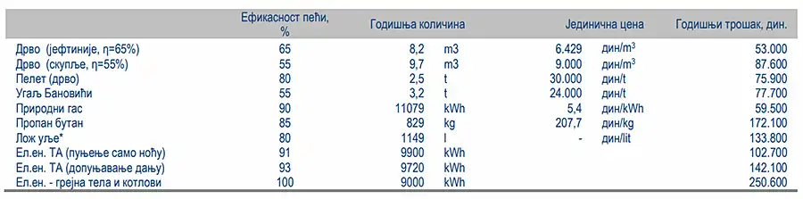 Navedeni iznosi, navodi se u analizi, obuhvataju samo troškove nabavke energije, odnosno goriva, a ne obuhvataju investicione troškove (npr. nabavku peći i ugradnju instalacija centralnog grejanja) i troškove periodičnih pregleda i održavanja.