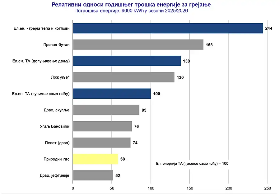 Troškovi grejanja korišćenjem prirodnog gasa ove grejne sezone su isti kao i prethodne, iznose 59,5 hiljada dinara što je za samo 6,5 hiljada dinara skuplje od najpovoljnijeg grejanja korišćenjem drveta.