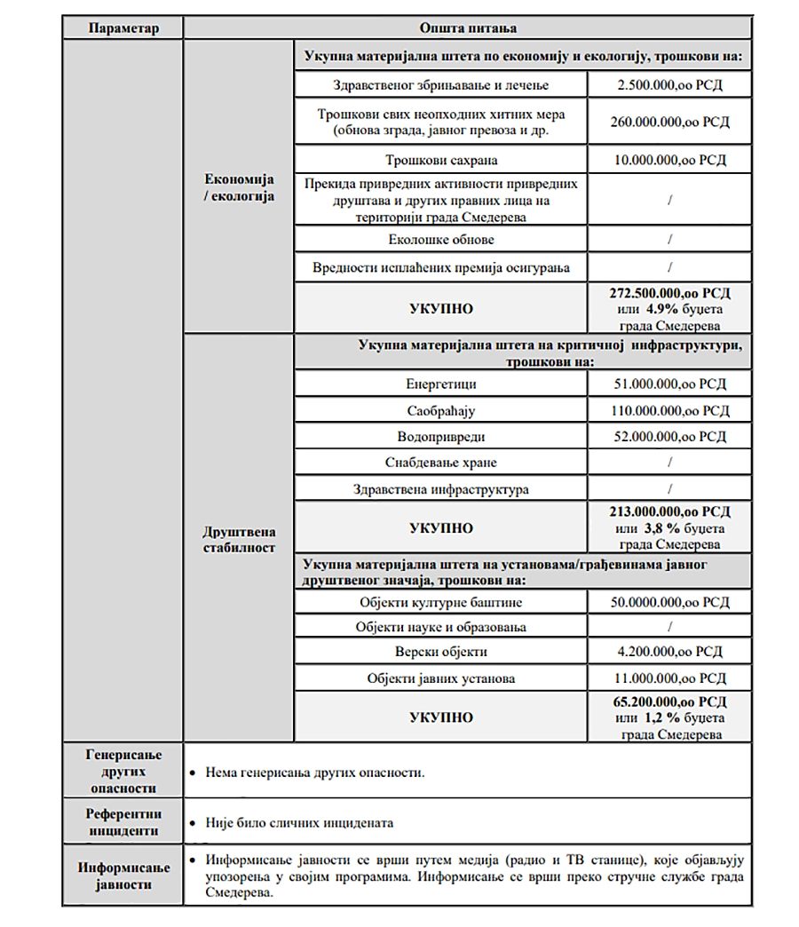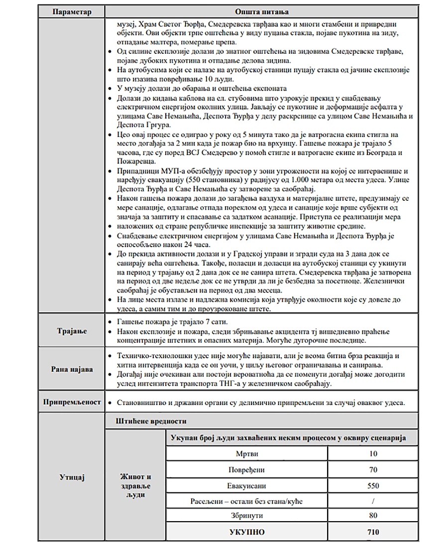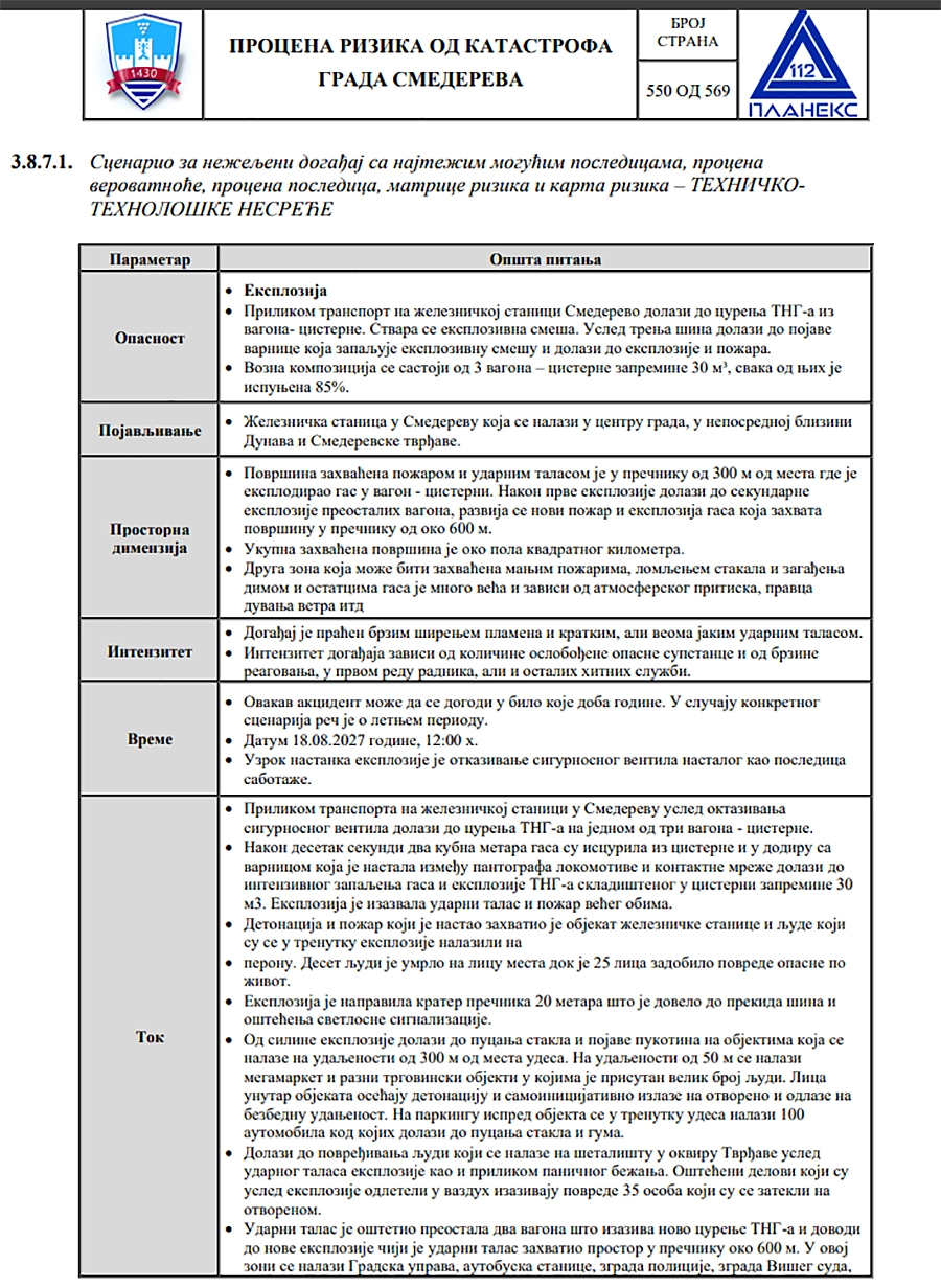 Kao što možete da vidite u faksimilu stranica iz obimnog dokumenta, oko 570 stranica ima, kao primer uzeta je eksplozija nakon curenja iz vagona sa TNG-om na železničkoj stanici. U gradaciji rizika ovaj događaj je svrstan u kategoriju „Visok“, ovo su direktno iz dokumenata preneti detalji i podaci kojima se to objašnjava, a kompletnu Procenu rizika od katastrofa grada Smedereva možete da vidite i preuzemet na ovom linku.