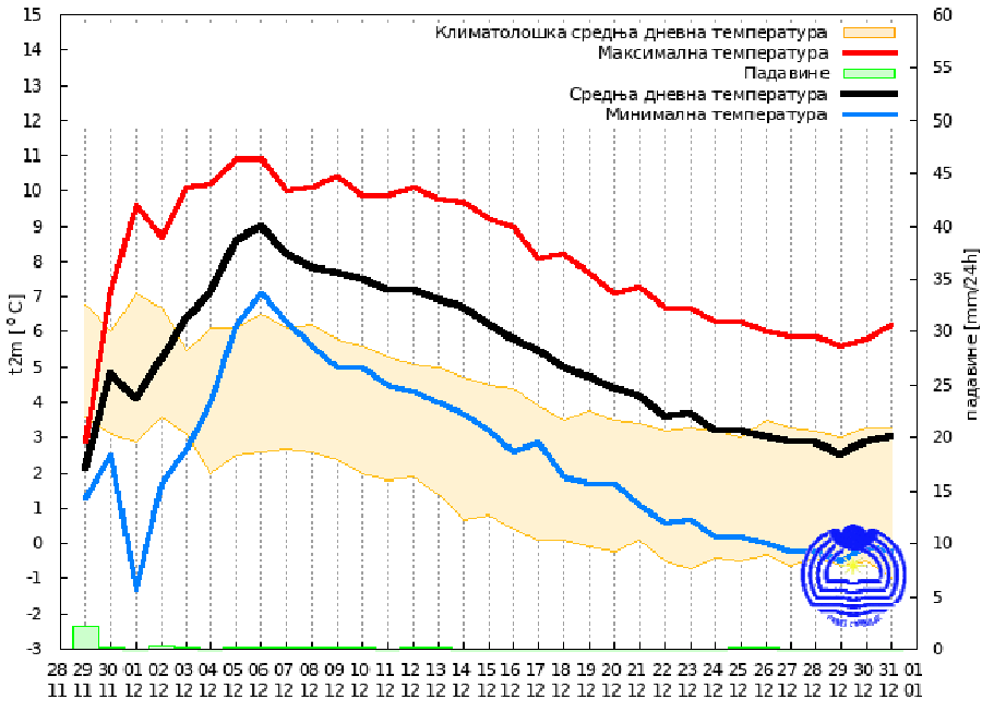 Sezonska prognoza RHMZ najavljuje da će se mesečna suma padavina tokom decembra zadržati u granicama višegodišnjeg proseka sa vrednostima u proseku do 5 mm nižim u odnosu na višegodišnji prosek.