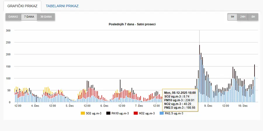 Na mernoj stnici u Partizanskoj ulici, recimo, satna koncentracija čestica PM 2,5 je 191 mikrograma po kubnom metru, a onih PM10 čak 217.