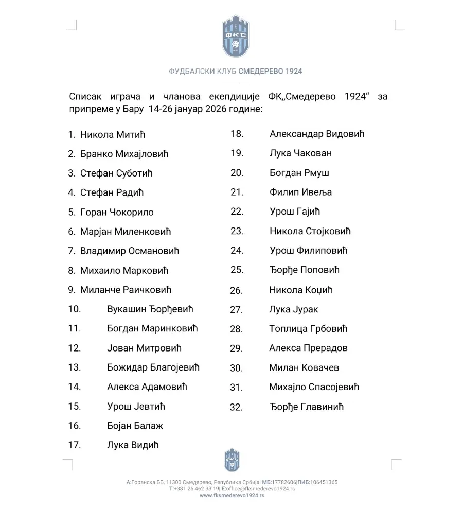 14. januar 2026 – Fudbaleri, članovi stručnog štaba i rukovodstva FK Smederevo 1924 jutro su krenuli put Bara, gde će do 26. januara imati pripreme za nastavak prvenstva Prve lige, koja startuje 14. februara.